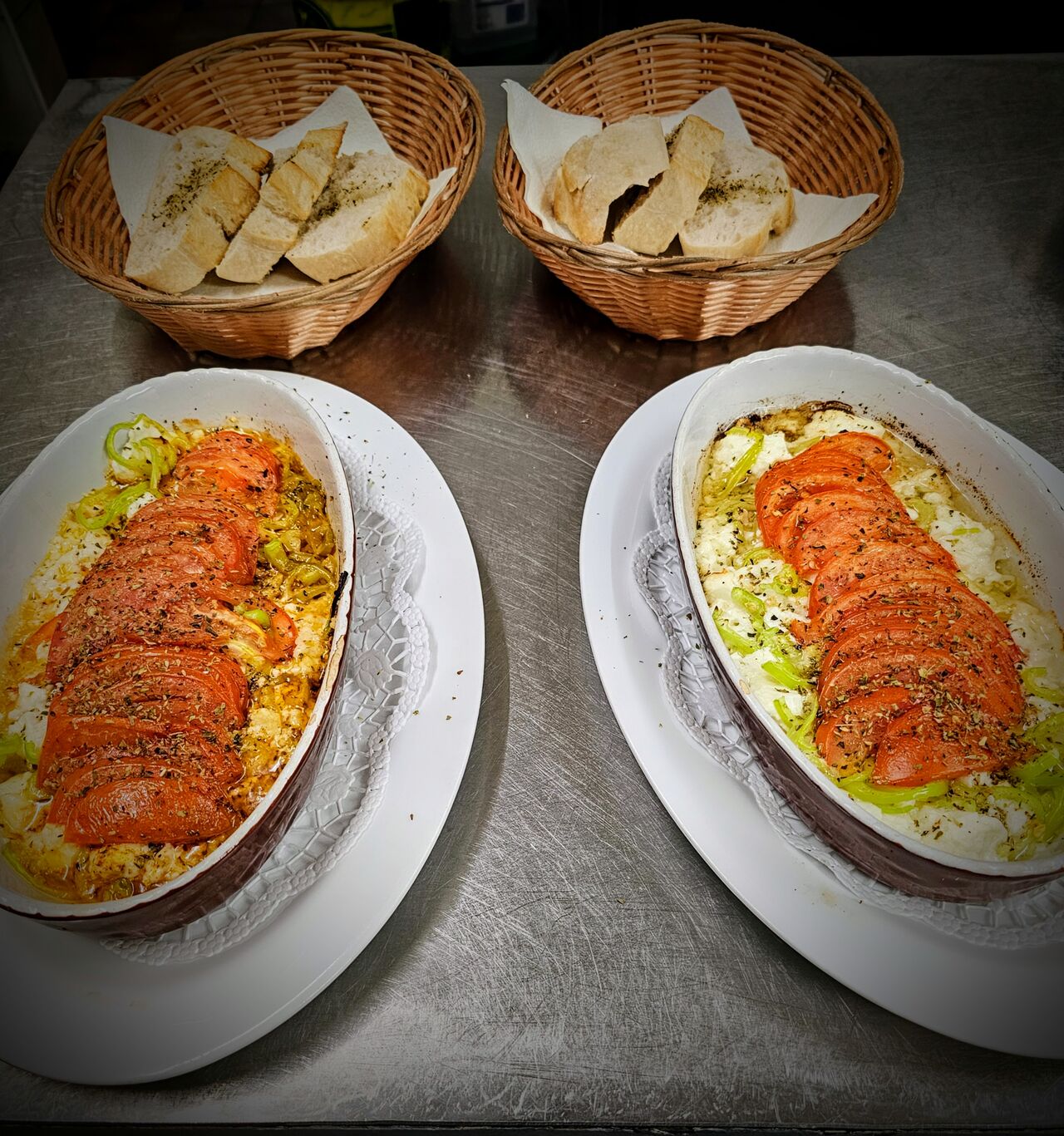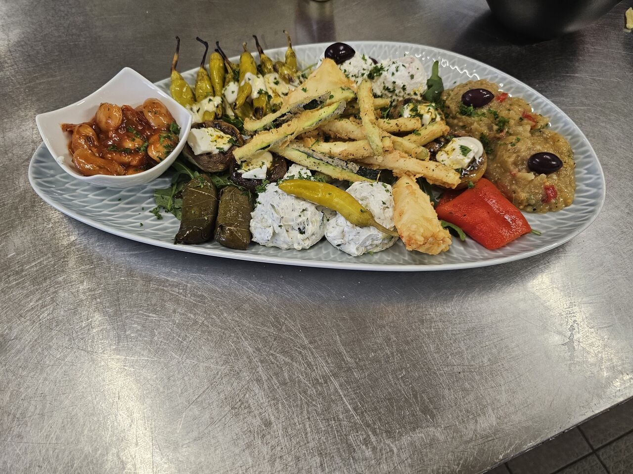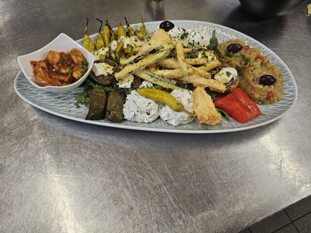 Starten Sie Ihr Menü mit typisch griechischen Vorspeisen wie dem traditionellen Tzatziki, einer köstlichen Kombination aus Joghurt, Gurken und Knoblauch, oder probieren Sie die würzigen, gefüllten Weinblätter Dolmadakia. Für Käseliebhaber ist unser gegrillter Feta mit frischen Tomaten und Peperoni ein echtes Highlight.